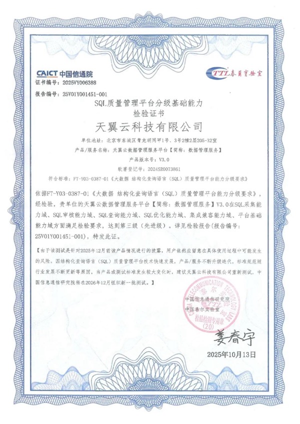 近日,天翼云數(shù)據(jù)管理服務(wù)(DMS)順利通過中國信息通信研究院“SQL質(zhì)量管理平臺分級基礎(chǔ)能力檢驗(yàn)”專項(xiàng)評測。依據(jù)《大數(shù)據(jù) 結(jié)構(gòu)化查詢語言(SQL)質(zhì)量管理平臺能力分級要求》標(biāo)準(zhǔn),在SQL采集、審核、查詢優(yōu)化三大能力域,以及系統(tǒng)兼容性與平臺基礎(chǔ)能力方面,天翼云數(shù)據(jù)管理服務(wù)(DMS)全面達(dá)到標(biāo)準(zhǔn)并獲頒最高級別“先進(jìn)級”證書。