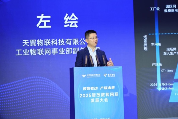 在2025物博會(huì)“智改數(shù)轉(zhuǎn)網(wǎng)聯(lián)”發(fā)展大會(huì)上,天翼物聯(lián)工業(yè)物聯(lián)網(wǎng)事業(yè)部副總經(jīng)理左繪分享了工業(yè)確定性網(wǎng)絡(luò)賦能企業(yè)數(shù)智化的成效。