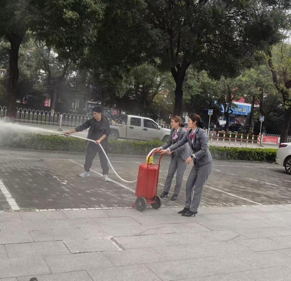 在她身后,不是遲疑和觀望,而是一支瞬間成型的“巾幗突擊隊”。 年輕員工袁海寧和張靜,便默契地沖向推車式滅火器。 “一、二、三! ”她們合力將其推出門檻,滅火器的輪子與地面摩擦發(fā)出急促的聲響,軟管在她們身后拖出一道決絕的弧線。